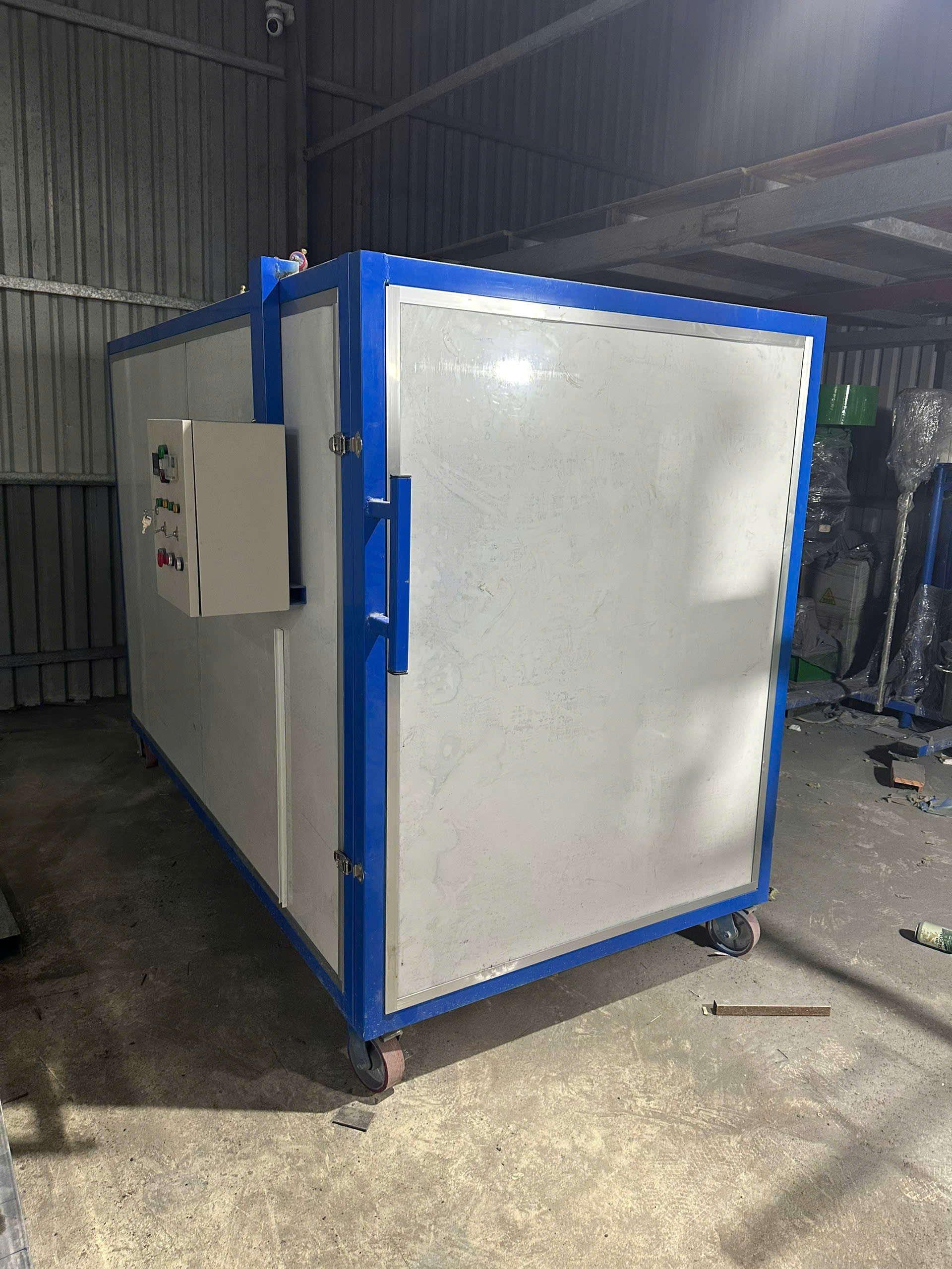 Lò sấy sơn tĩnh điện được thiết kế với kích thướt rộng 1200mm x cao 2000mm x dài 2400mm phù hợp cho các xưởng sản xuất vừa và nhỏ, chuyên dùng để sấy sơn tĩnh điện các sản phẩm kim loại, khung thép, nhôm định hình sau khi sơn tĩnh điện. Thiết bị có khả năng gia nhiệt nhanh, phân bổ nhiệt đồng đều, giúp lớp sơn bám chắc, bóng đẹp, bền màu và chống bong tróc.
